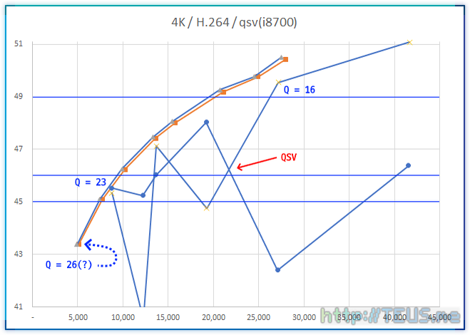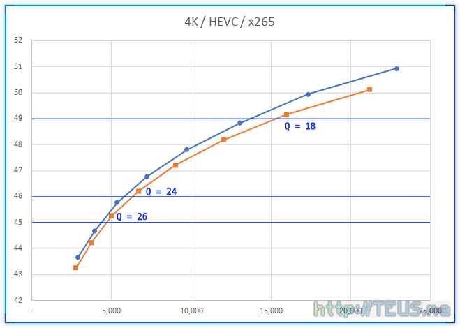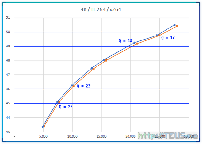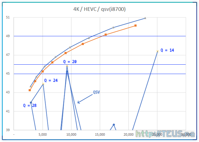다시 말하면, 4K 영상에 대해서 Q 값은 PSNR이 49 이상이면 거의 무손실[각주:1], 46 정도면 충분히 양호하며 45 이상이면 사용할만한 품질로 이해할 수 있다는 것.