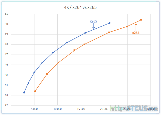 - x265는 x264에 비해 동일 화질 기준으로 파일 크기가 65% 정도를 달성함