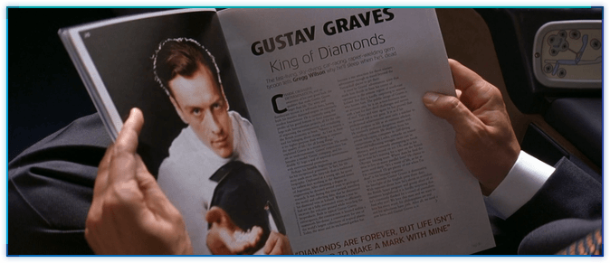 b. Diamonds Are Forever 본드가 비행기에서 구스타프 그레이브의 기사를 읽는 장면에서, 잡지 맨 아래에 적힌 문구는 "