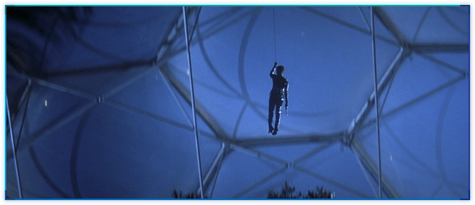 두번산다에서 닌자들은 스펙터 기지의 천장에서 줄을 타고 침입합니다.
