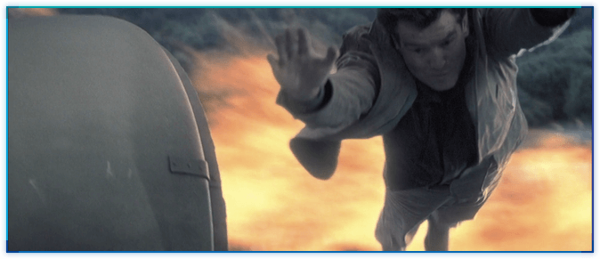 이 장면은 TWINE에서 본드의 등 뒤에서 폭탄이 터지는 것을 피해서 점프하는 장면과 유사합니다.