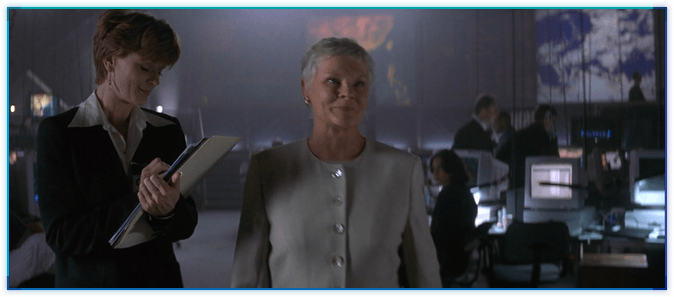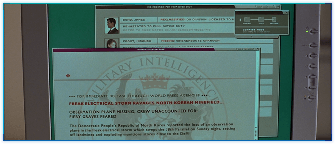 TND의 마지막 장면에서 M은 머니페니에게 엘리엇 카버에 대한 위조 기사를 쓰도록 합니다.