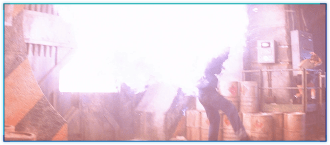 DAD의 오프닝 액션에서 문 대령이 화염방사기로 본드를 태우려고 하자 펄쩍 뛰어 피합니다.