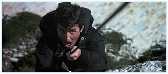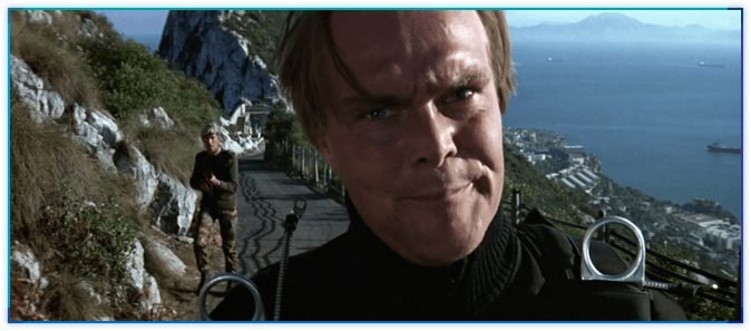 004, 007과 함께 지브롤터 해협의 레이더 기지에 침투하는 훈련에서 제일 먼저 페인트 탄을 맞습니다.