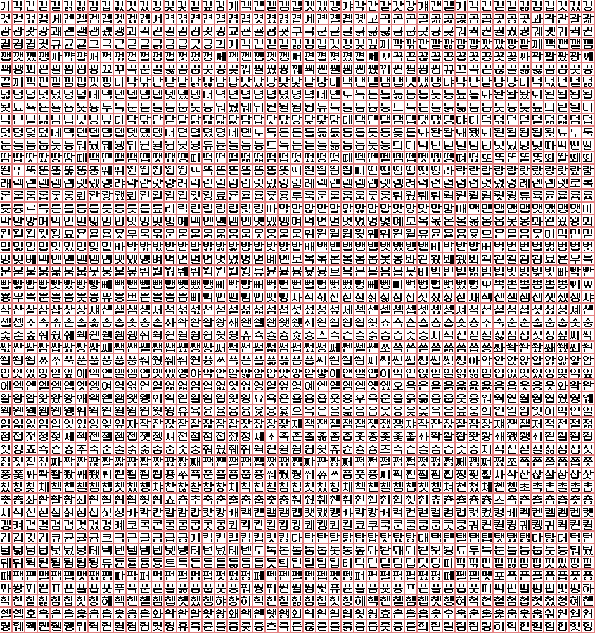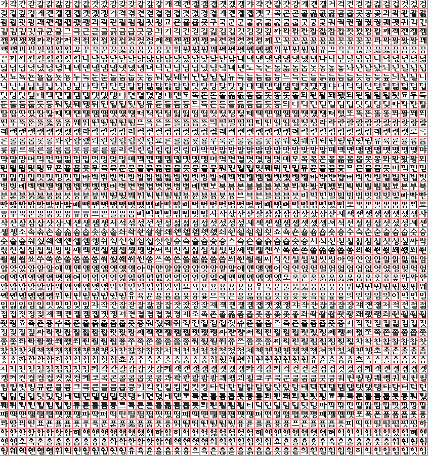 이 자소들을 적절히 2,350번 조합하면 역시 아래와 같은 KS2350 글자들을 볼 수 있다.