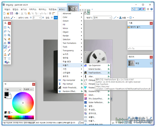 이 플러그인은 아래 링크에서 다운받을 수 있으며, 압축을 푼 뒤 Paint.NET 설치 폴더 아래의 Effects 폴더에 저장하면 설치된다.