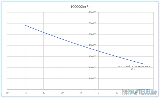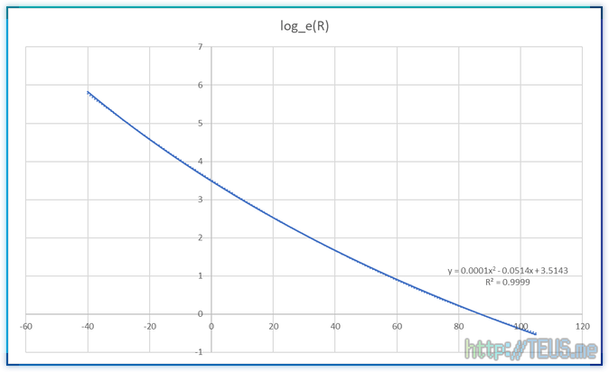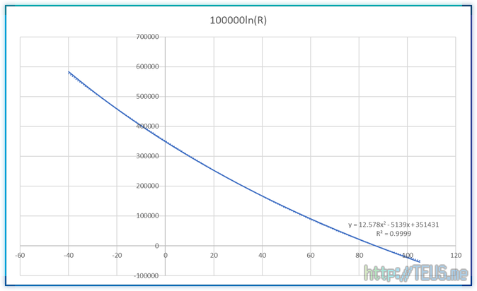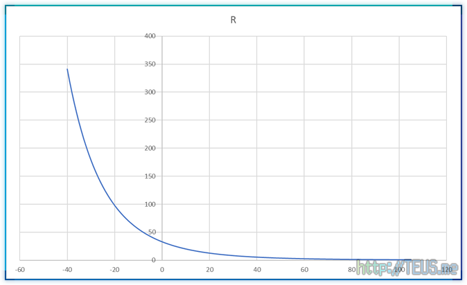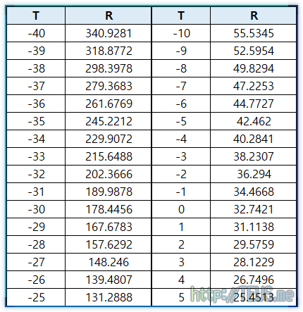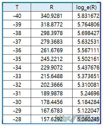 이 센서는 온도에 따른 출력 저항값을 한 장의 시트로 제공하는데, 대략 아래와 같은 내용이다.