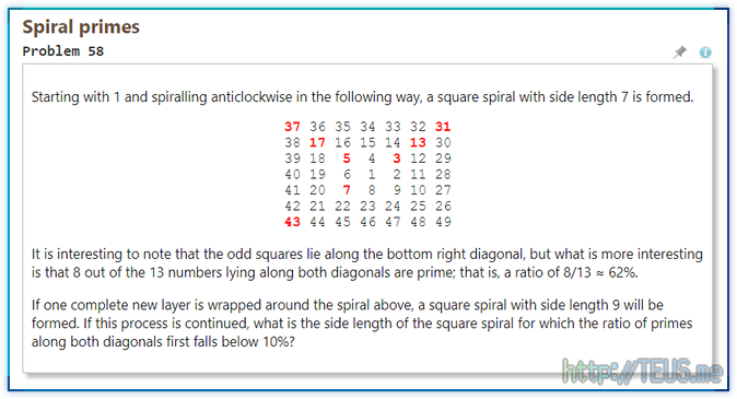 printf("width: %u, diagonal: %u, count: %u, ratio: %g%%\n", width, width * 2 - 1, count, (double)count / (width * 2 - 1) * 100);