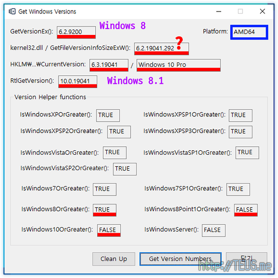 일단 GetVersionEx()의 결과는 6.2 즉, Windows 8이라고 나온다.