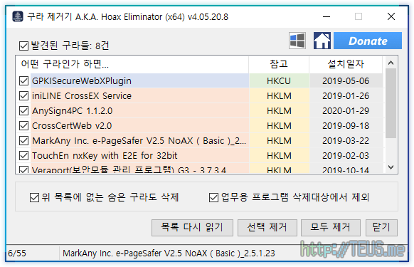 모두 제거 버튼을 클릭하기 전에 반드시 목록을 확인하시기를 강력히 권고드립니다.