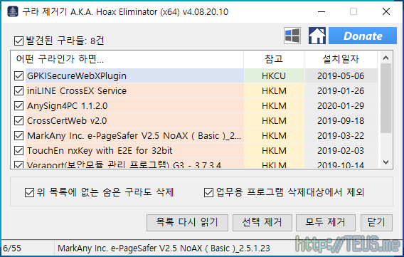 모두 제거 버튼을 클릭하기 전에 반드시 목록을 확인하시기를 강력히 권고드립니다.