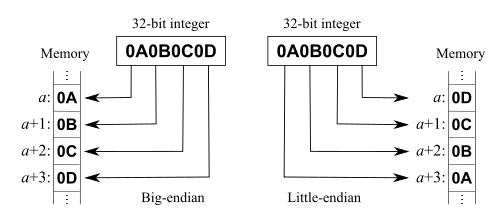 보통 Big-endian과 Little-endian 두 가지가[각주:1] 있는데, 메모리에 여러 바이트 연속된 자료가 저장되는 순서를 말한다.