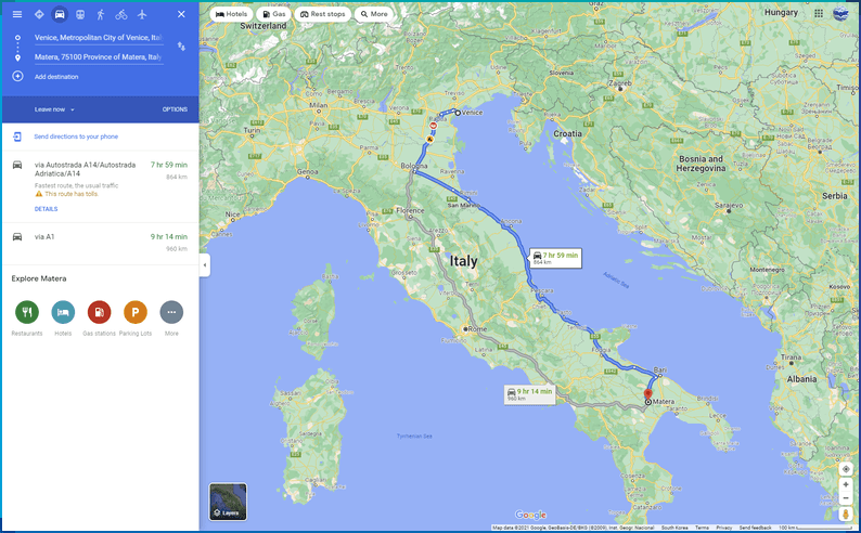 그런데, 문제는 베니스와 베스퍼의 묘지가 있는 마테라(Matera)는 비행기로 1시간 15분, 차로 8시간 정도 걸린다는 점이다.