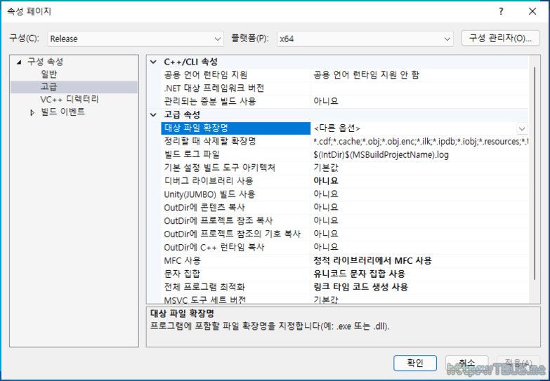 우선 솔루션 탐색기에서 모든 프로젝트[각주:2]를 선택해서 MFC 사용 및 문자 집합을 아래와 같이 수정한다.