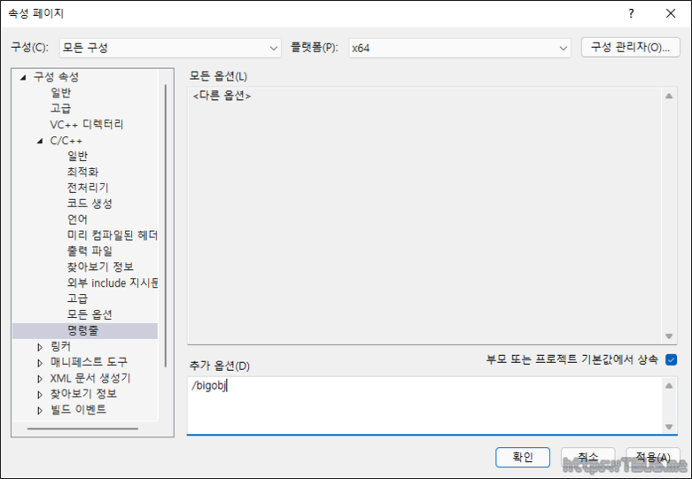 4개의 프로젝트들은 C/C++ 명령줄에서 /bigobj를 설정해줘야 한다.