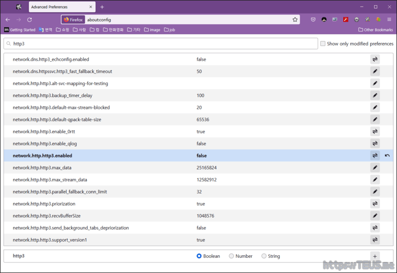 그리고 http3을 찾은 뒤 아래와 같이 network.http.http3.enabled를 false로 변경.