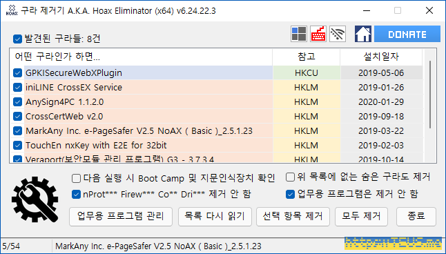 PC에 설치된 프로그램들 중에 제거해야 될 프로그램들의 목록을 띄워준 것이다.