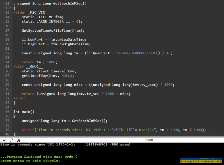 printf("Time in seconds since UTC 1970-1-1:\t%llu (%llu msec)\n", ullEpoch, mSec);