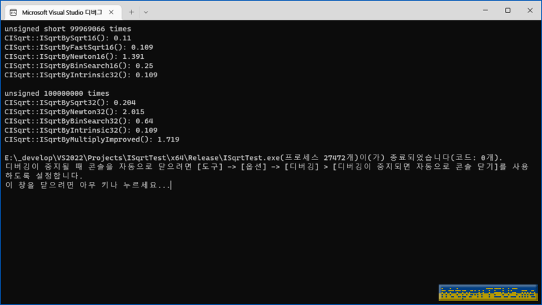 그런데, 순수하게 정수 범위에서 동작하는 제곱근 함수가 있다면 조금은 더 빠르게 동작할 것 같다.