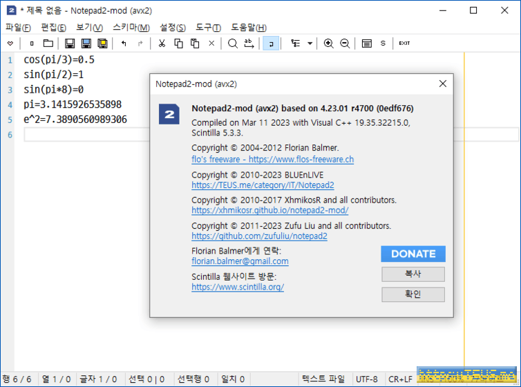 - Ctrl+Enter를 누르면 수식을 계산하는 기능 추가(삼각함수, log, fac, pow, sqrt 등의 함수와 pi, e 등을 지원)