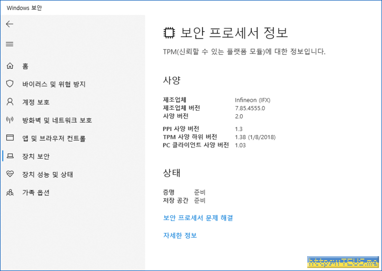 그리고, 이렇게 TPM을 활성화한 뒤에는 윈도우의 설정 화면에서 아래와 같이 TPM의 정보를 확인할 수 있다.