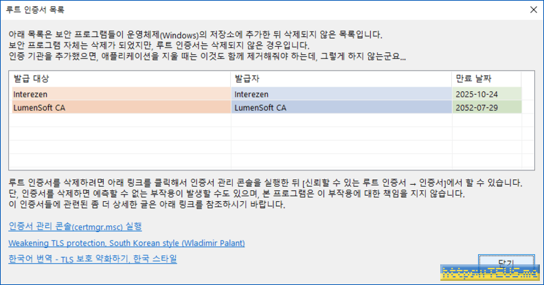 - 루트 인증서 목록 중 보안 프로그램 삭제 후에도 삭제되지 않은 인증서를 표시해주는 기능 추가
