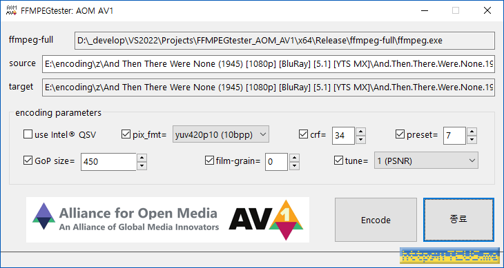 좌충우돌 끝에 확인한 건 SvtAv1EncApp.exe는 포기해야 되고, ffmpeg.exe 빌드 중에서 full version을 사용해야 한다는 것.