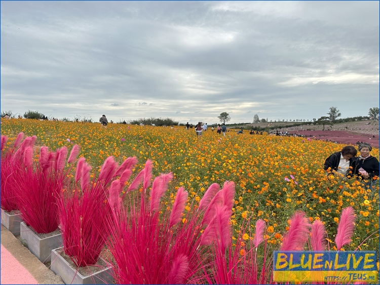코스모스 주변에 뭔가 부들부들한 분홍색 식물은 핑크뮬리다.