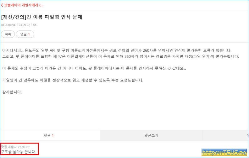 팟플레이어 역시 같은 문제가 있어 개발자에게 문의를 하였으나, 해결이 불가능하다는 답을 받았다.