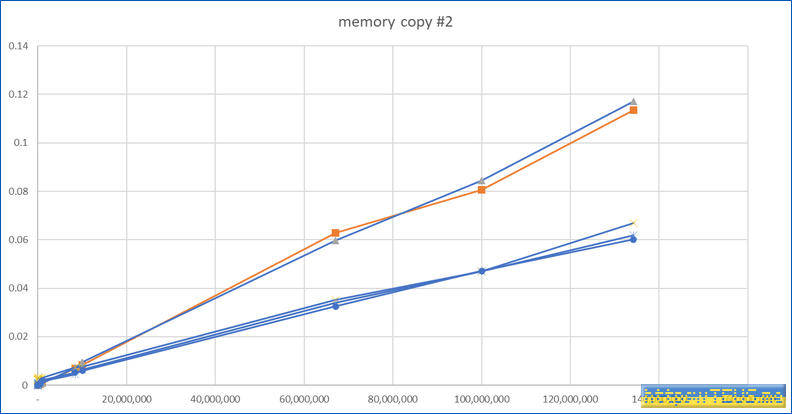 300만..400만 바이트 구간에서 더 위쪽으로 가는 둘이 병렬수행을 하지 않는 memcpy()와 AVX2의 결과.