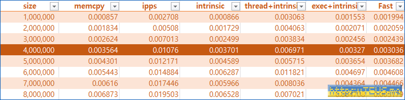 표를 다 읽을 필요는 없고, 100만개 정도(즉, 800만 바이트 정도)부터는 병렬수행을 통한 복사가 더 빨라진다는 점만 보면 될듯.