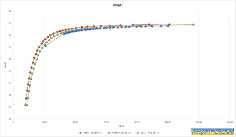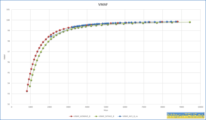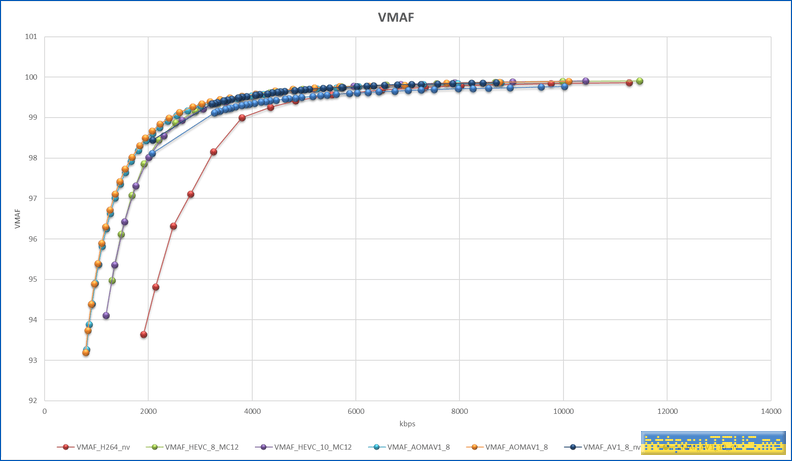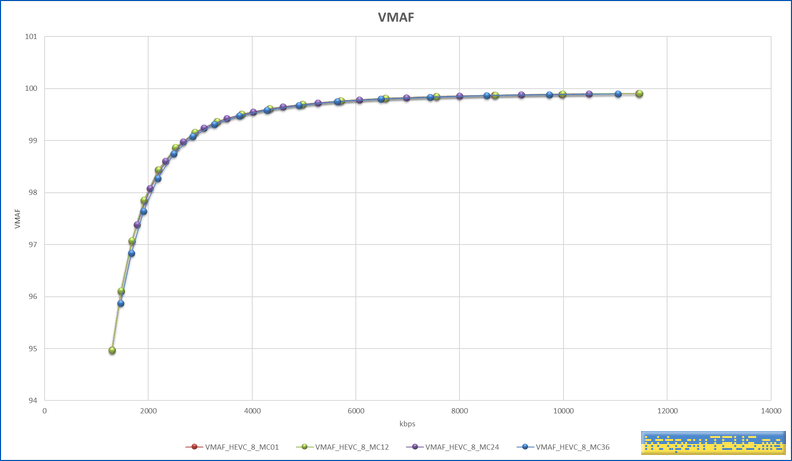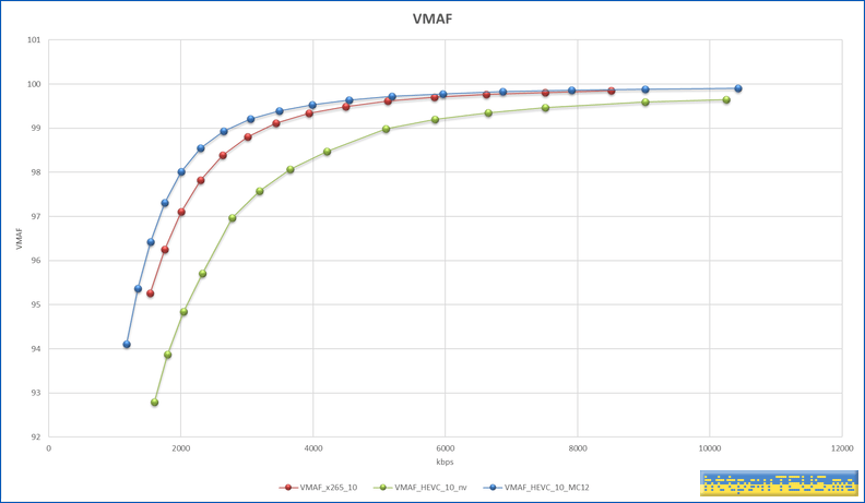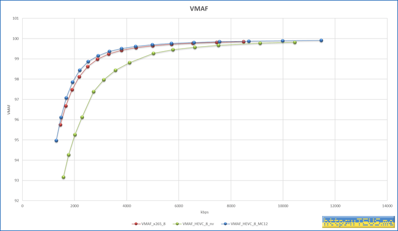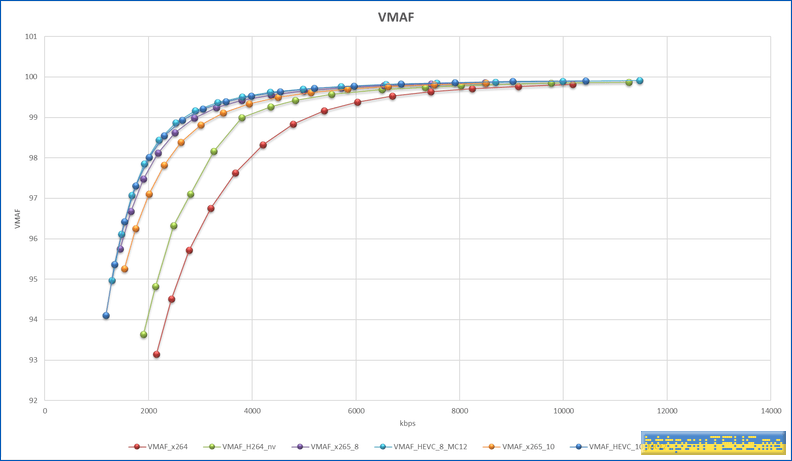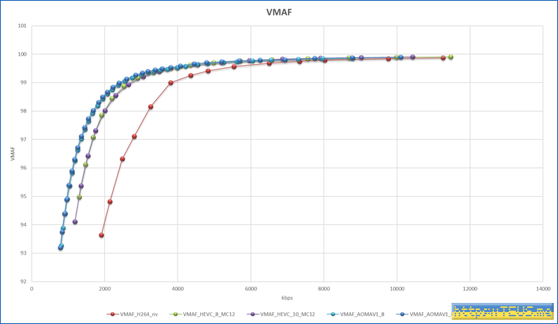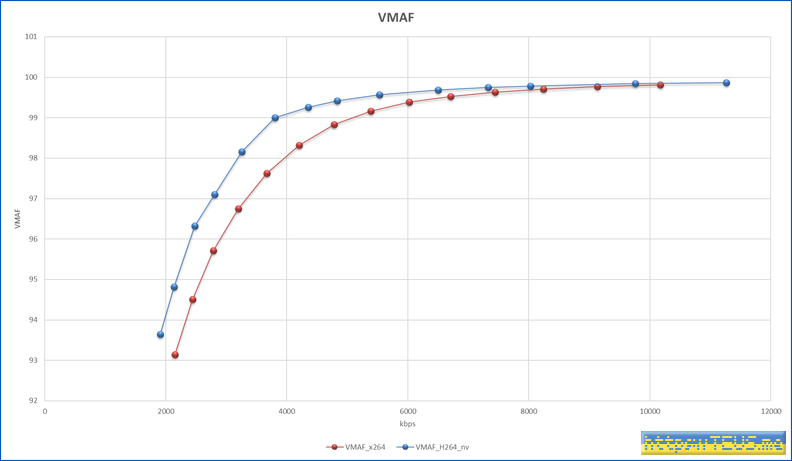 VMAF는 99점을 거의 무손실로 보면 되는데, 99점에서 x264에 비해 대부분의 용량이 50% 수준이다.